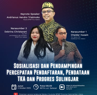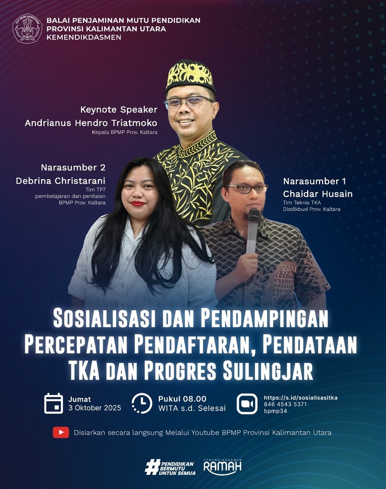 Kegiatan sosialisasi dan pendampingan ini akan dilakukan secara daring, sehingga memungkinkan partisipasi dari berbagai pihak tanpa hambatan jarak maupun waktu. Dengan pendekatan ini, sekolah, pendidik, dan pemangku kepentingan pendidikan di seluruh wilayah Kalimantan Utara dapat terlibat aktif dalam memahami alur pendaftaran, teknis pendataan, hingga pemantauan progres pelaksanaan TKA dan Sulingjar. Melalui pendampingan yang sistematis, BPMP berharap tidak ada lagi kesenjangan informasi atau kendala administratif yang dapat menghambat keberhasilan penyelenggaraan program pendidikan tersebut.